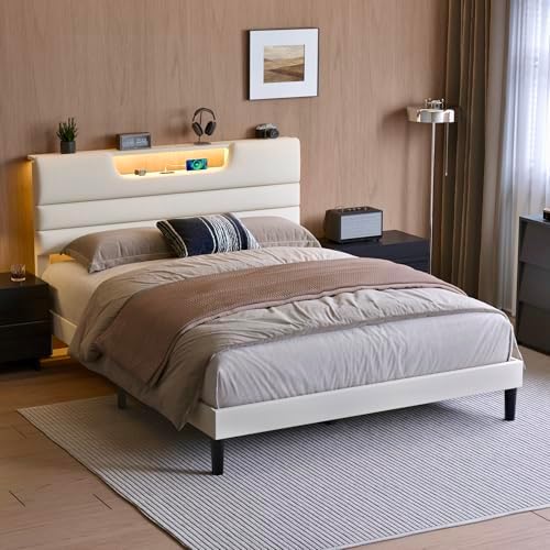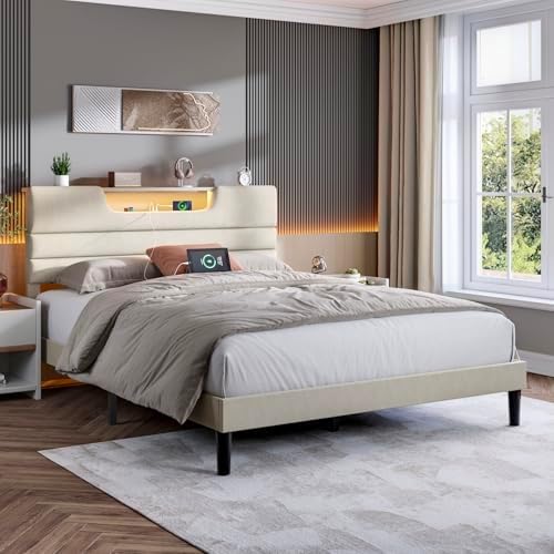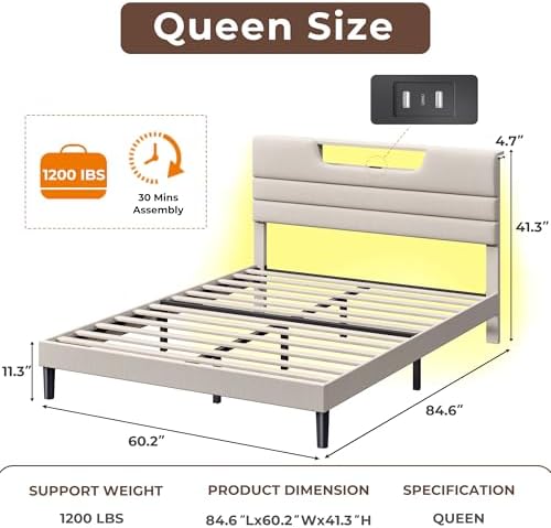 Built from high-quality metal and wood, this beige queen-size bed frame supports heavy-duty legs with protective covers to avoid floor scratches. Offering remarkable sturdiness and a 1,200-pound weight capacity, its solid wood slat construction paired with EVA noise-dampening strips guarantees a quiet sleeping environment. Compatible with memory foam and spring mattresses, no box spring is needed.