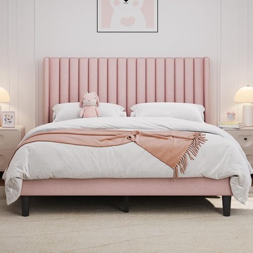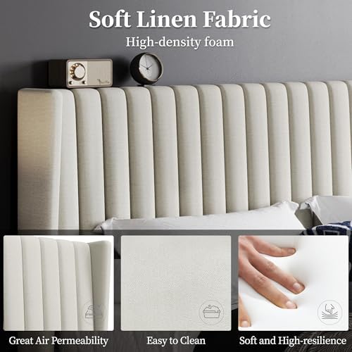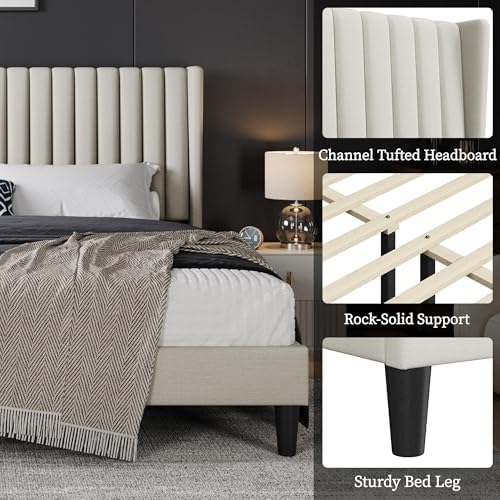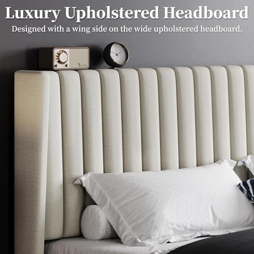Transform your bedroom with our classic king upholstered bed frame. Featuring a simple geometric wing side style and a stylish channel headboard, this bed is designed with skin-friendly linen fabric to enhance your room’s decor while providing unmatched comfort.